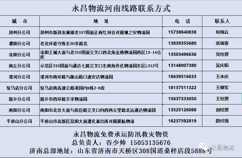 即日起,永昌物流將免費承運發往河南的防汛救災捐贈物資!免費承運線路包括鄭州、濮陽、洛陽、商丘、漯河、駐馬店、新鄉、南陽、平頂山等地。以下是聯系方式及地址,請有需求的企業或個人隨時聯系我們!