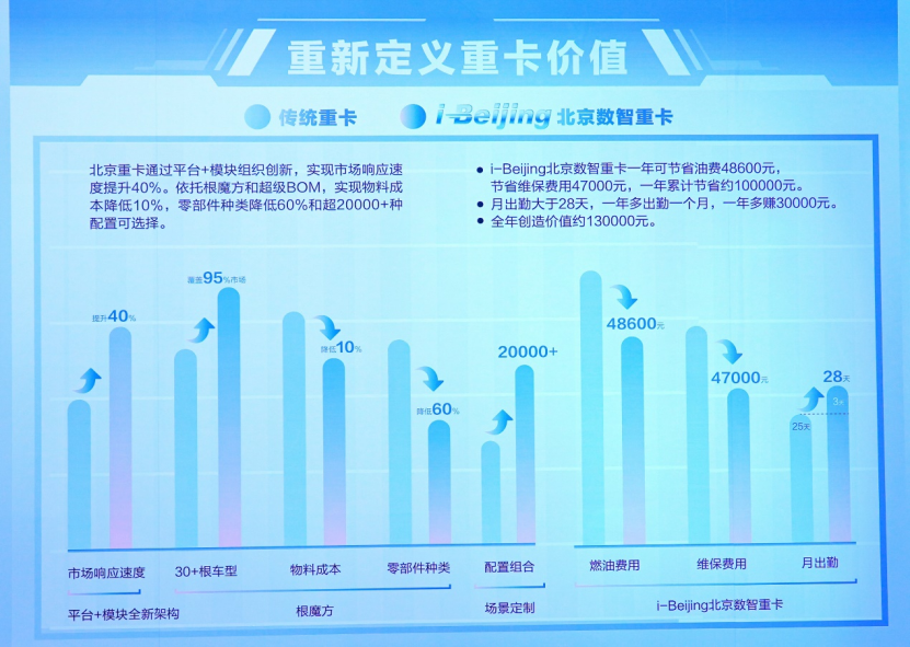 憑借Smart AEO智能自主尋優節油系統、Smart SAVE智能云控節油系統、Smart EBP智能油耗管理系統、Smart EBI智能制動系統4大“Smart”核心系統加持,北京重卡在實現智能節油與智能安全的同時,每年可以節省油費48600元,節省維保費用47000元。高質量的北京重卡可以達到月出勤大于28天,一年多出勤一個月,一年多賺30000元,全年創造價值可達130000元。