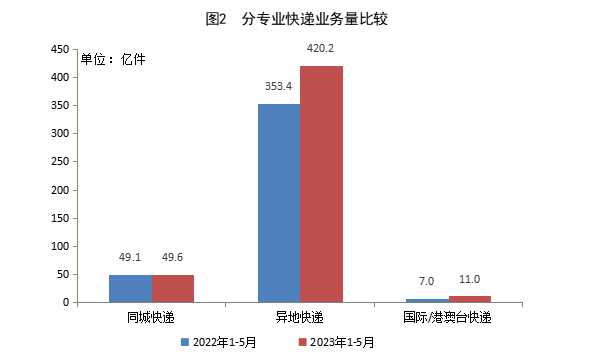 1-5月,同城快遞業(yè)務(wù)量累計(jì)完成49.6億件,同比增長1.2%;異地快遞業(yè)務(wù)量累計(jì)完成420.2億件,同比增長18.9%;國際/港澳臺(tái)快遞業(yè)務(wù)量累計(jì)完成11.0億件,同比增長56.9%。