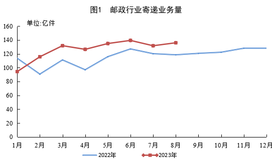 8月份,郵政行業(yè)寄遞業(yè)務(wù)量完成135.9億件,同比增長14.8%。其中,快遞業(yè)務(wù)量完成111.6億件,同比增長18.3%。