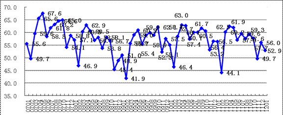 中國非制造業PMI指數體系,由商務活動、新訂單、新出口訂單、積壓訂單、存貨、中間投入價格、收費價格、從業人員、供應商配送時間、業務活動預期10項擴散指數構成。由于沒有合成指數,國際上通常用商務活動指數來反映非制造業經濟發展的總體情況,一般來說該指數達到50%以上,反映非制造業經濟總體上升或增長;低于50%,反映非制造業經濟下降或回落。
