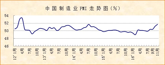 中國物流與采購聯(lián)合會、國家統(tǒng)計局服務(wù)業(yè)調(diào)查中心發(fā)布的2016年11月份中國制造業(yè)采購經(jīng)理指數(shù)(PMI)為51.7%,較上月上升0.5個百分點,該指數(shù)最近兩月上升明顯,指數(shù)水平達到2014年8月份以來的最高值,高于去年同期2.1個百分點。主要分項指數(shù)新訂單、生產(chǎn)、采購量指數(shù)普遍回升,高于去年同期2個百分點以上。綜合來看,當(dāng)前經(jīng)濟運行態(tài)勢良好,企穩(wěn)基礎(chǔ)進一步鞏固,向好發(fā)展態(tài)勢更為明顯。